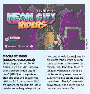Construyendo ExperienciaDurante los siguientes tres años y medio, el equipo trabajó arduamente, aprendiendo todo lo posible sobre la industria y el desarrollo de videojuegos, y asistiendo a la mayor cantidad de eventos posibles. Jorge García moderó un panel en PAX South, mientras Neon City Riders fue seleccionado para la Official Selection de PAX Rising en PAX East 2020 y para el Indie Showcase 2020 Official Selection en PAX East. Mecha Studios se convirtió en el primer estudio del sureste de México en lanzar un juego multiplataforma a nivel internacional, y hoy sigue siendo uno de los referentes más importantes del desarrollo de videojuegos en México.