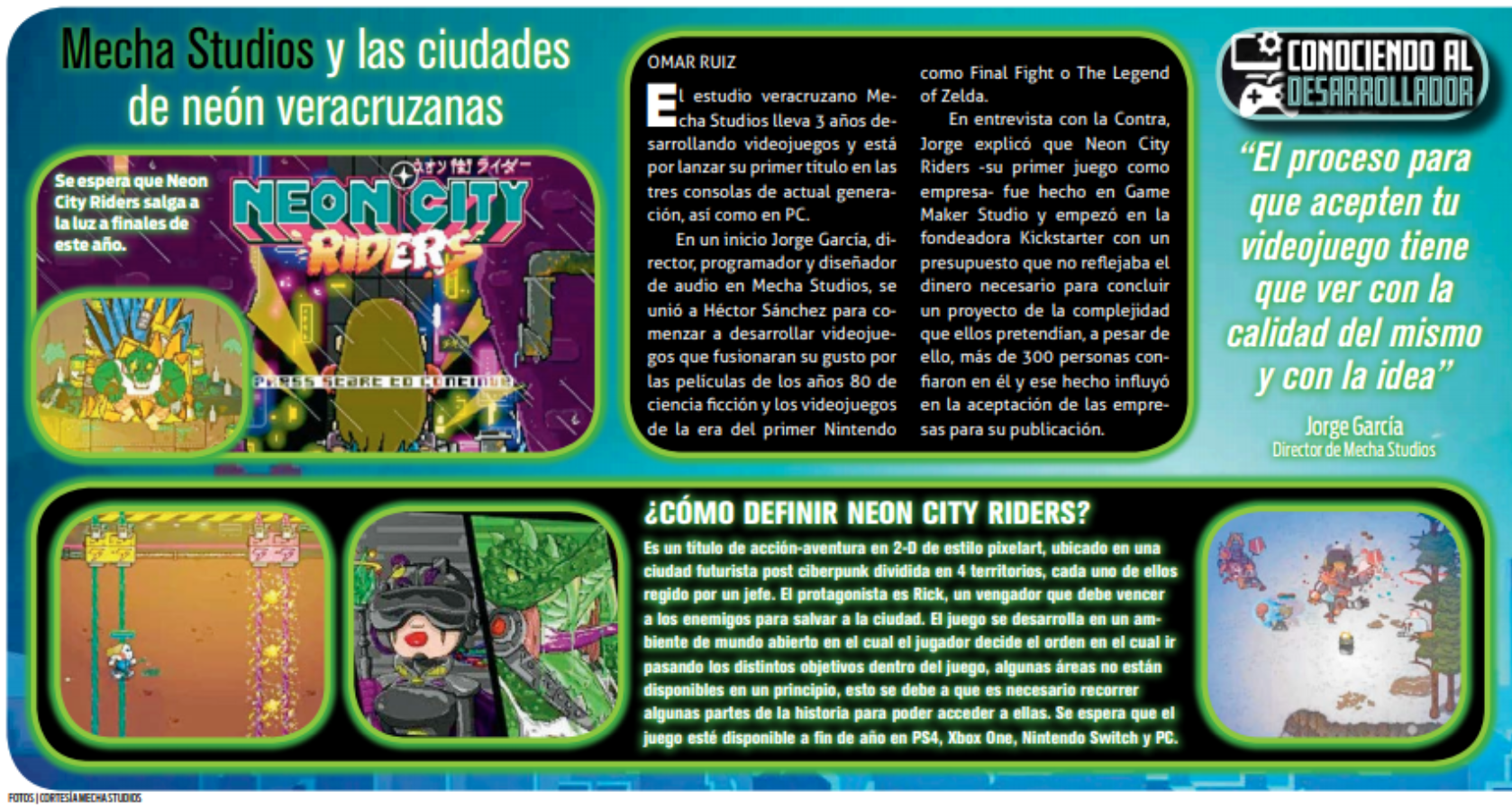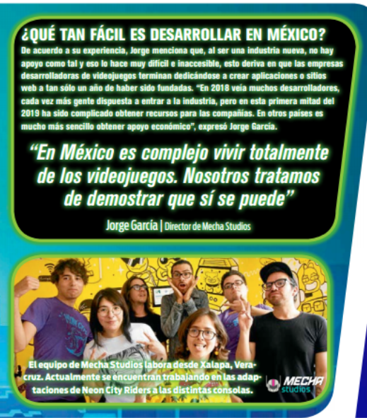 Construyendo ExperienciaDurante los siguientes tres años y medio, el equipo trabajó arduamente, aprendiendo todo lo posible sobre la industria y el desarrollo de videojuegos, y asistiendo a la mayor cantidad de eventos posibles. Jorge García moderó un panel en PAX South, mientras Neon City Riders fue seleccionado para la Official Selection de PAX Rising en PAX East 2020 y para el Indie Showcase 2020 Official Selection en PAX East. Mecha Studios se convirtió en el primer estudio del sureste de México en lanzar un juego multiplataforma a nivel internacional, y hoy sigue siendo uno de los referentes más importantes del desarrollo de videojuegos en México.